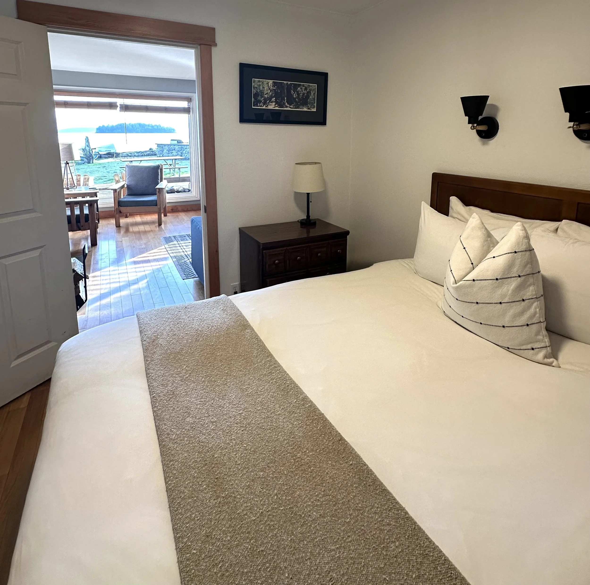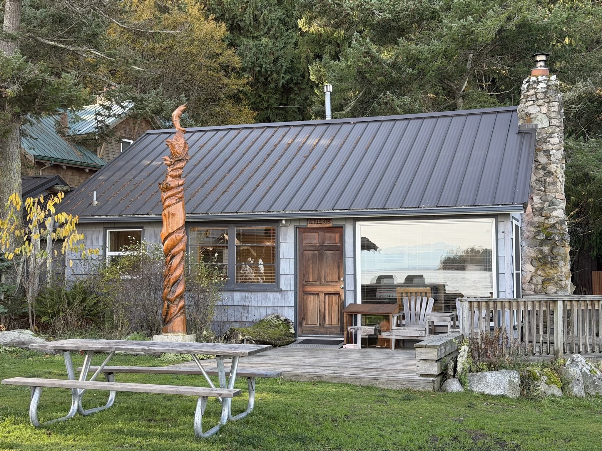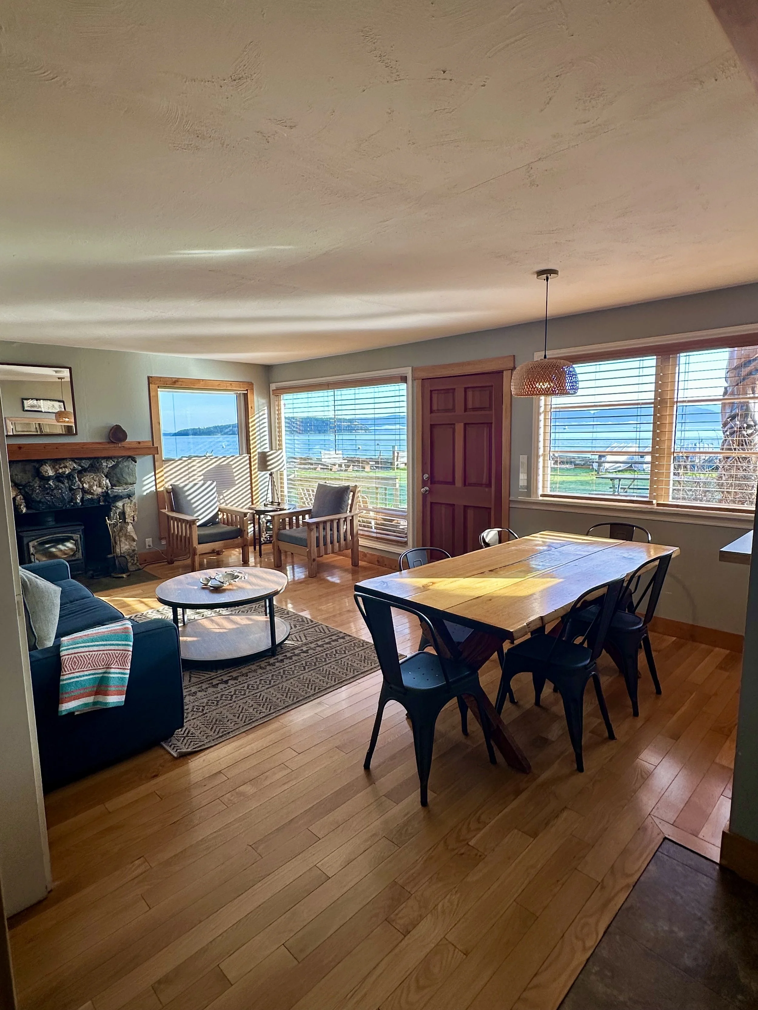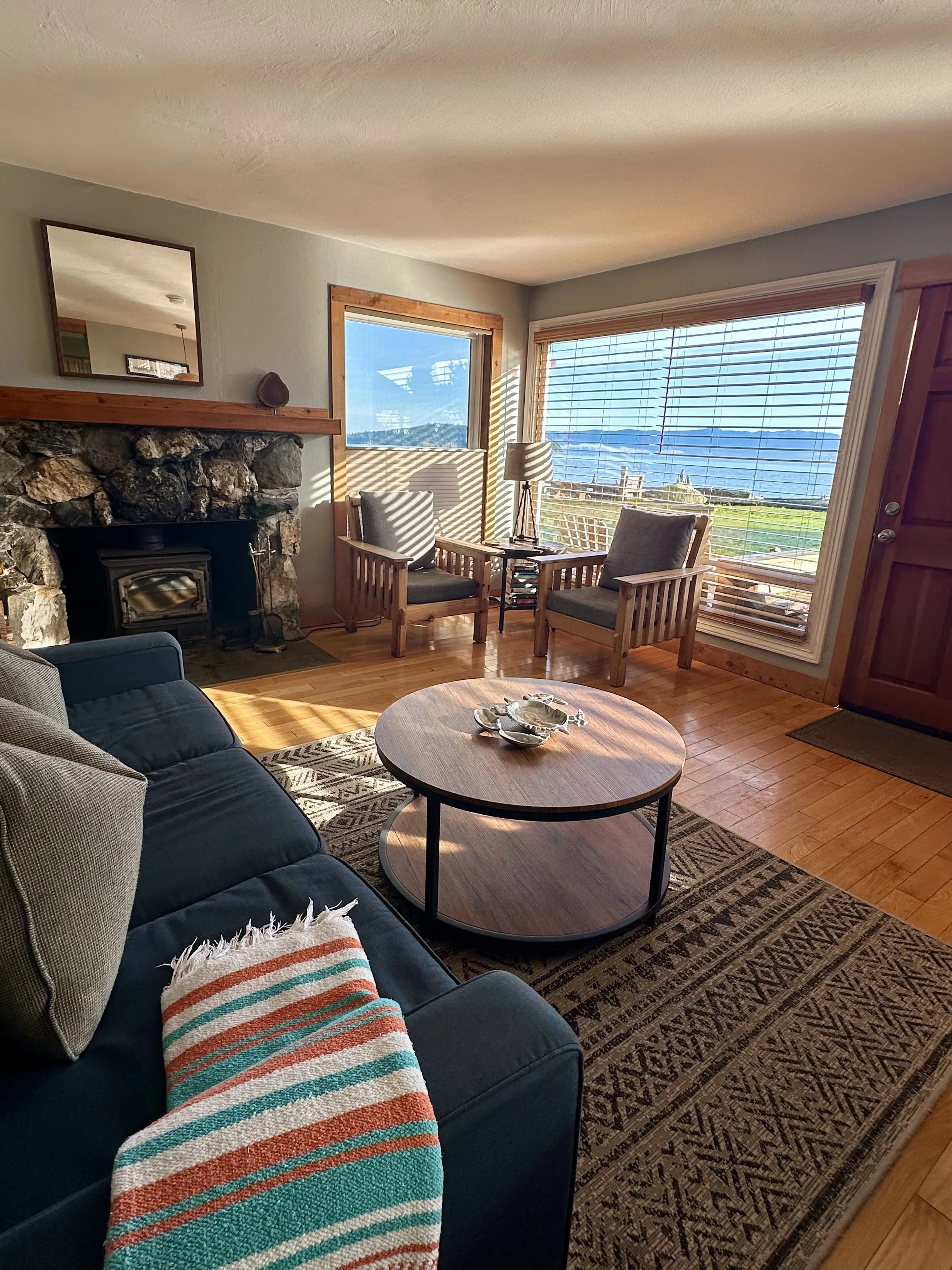 Beachfront Baker House has large picture windows that frame Mt. Baker to the east and allows expansive views of the water and the nearby islands. It has a fully-equipped kitchen, living/dining room, large bathroom with shower seat and hand rails. Baker House has two bedrooms with one queen bed in each. The house is heated with propane and wood heat. There is also a queen-size sleeper sofa in the living room. The house has a private front deck and picnic table, just steps from the water, to enjoy spectacular views! Baker is a wheelchair-accessible house.