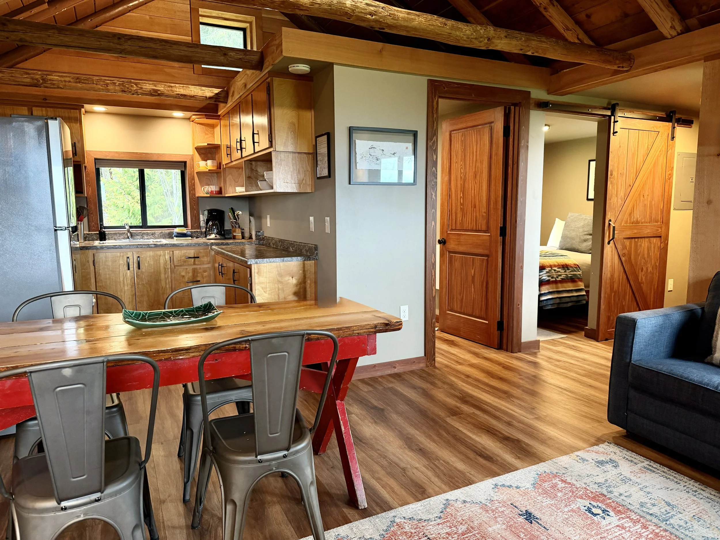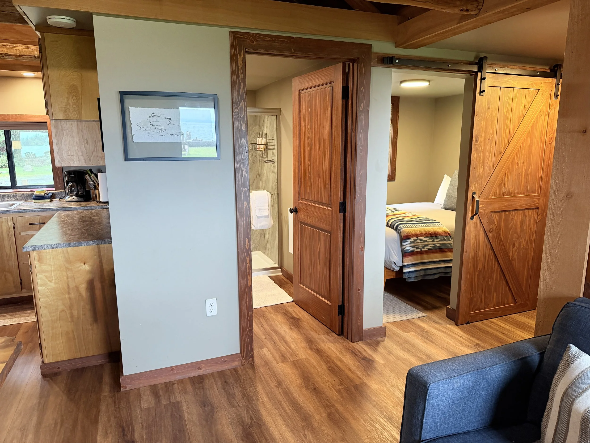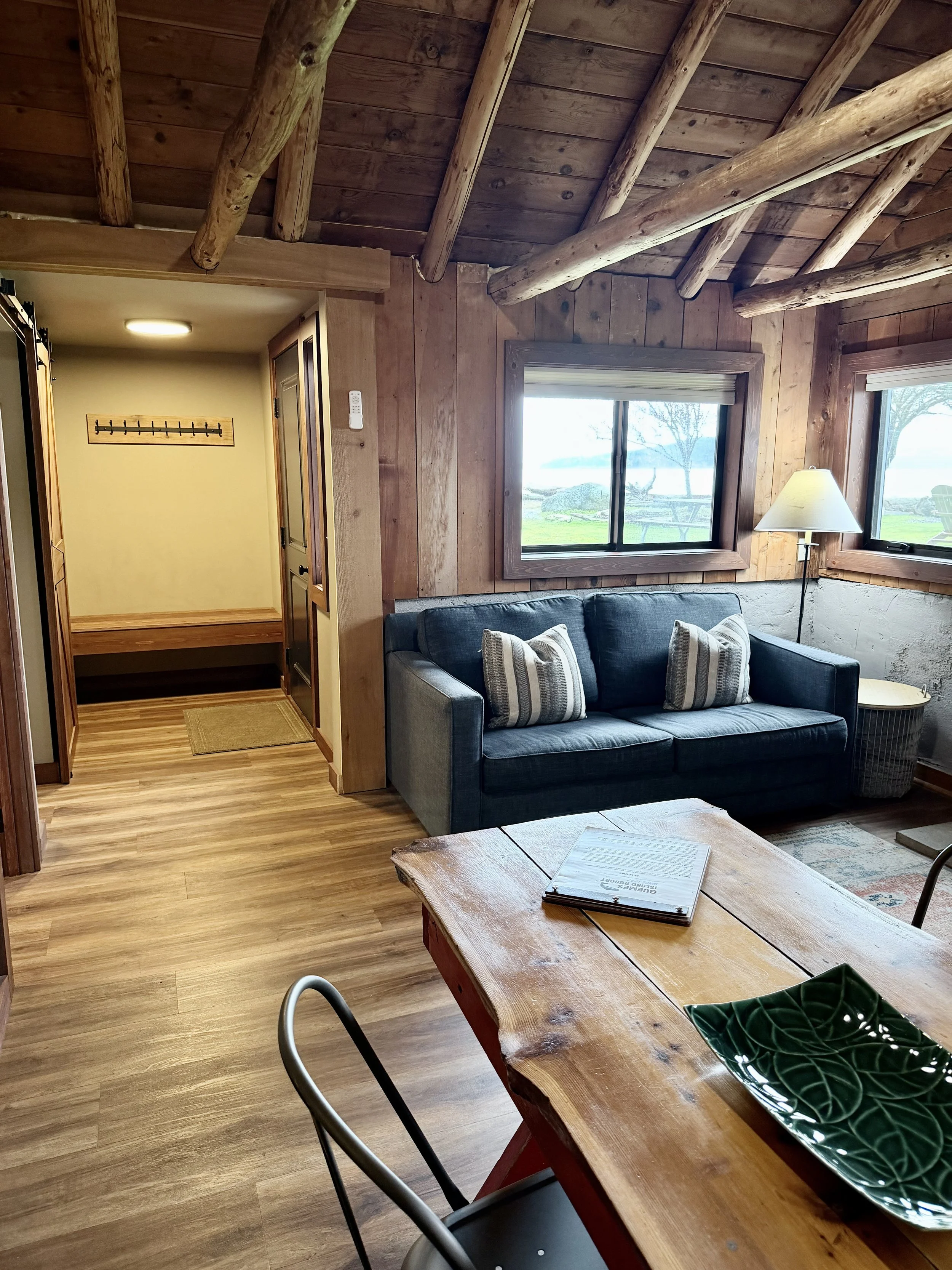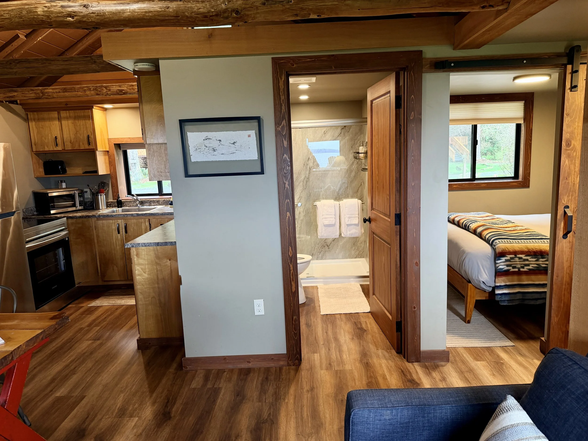 Swinomish is a newly renovated beachfront cabin, just steps from the beach and water, with stunning views of Mount Baker and the nearby islands! There is a full kitchen and a full bath with shower. The cabin is heated with a wood stove and has additional electric heaters in the bedroom, bathroom and living room. Swinomish is a one-bedroom cabin with a queen-size bed. The living room has a full-size sleeper sofa. (*bedroom has less than standard 36” bed clearance). Each cabin has a private picnic table.