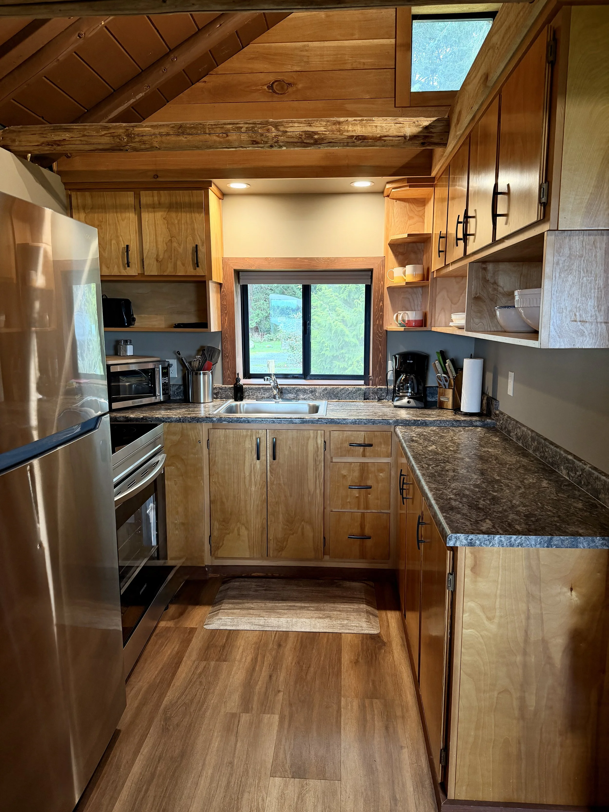 Fully equipped kitchen includes full size oven, toaster, coffee maker, and coffee grinder